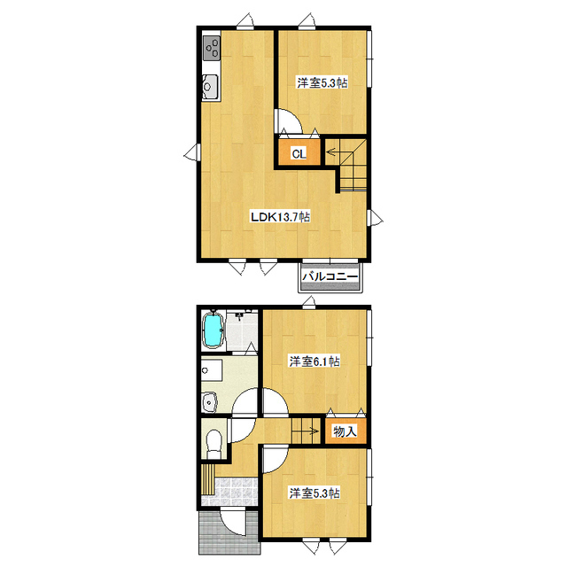 間取り詳細 | 洋室5.3,洋室5.3,和室6.1,LDK13.7 | ||